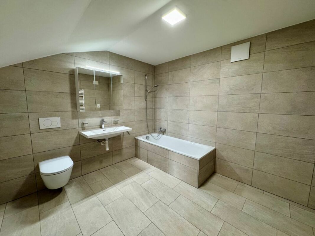 Salle de bain avec baignoire, équipée pour accueillir une colonne de lavage