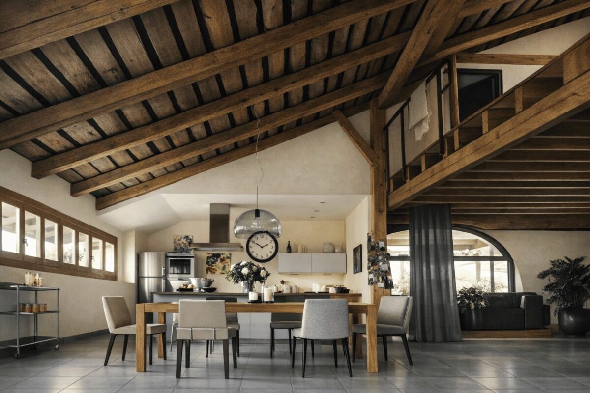 Les poutres anciennes, les textures authentiques et les lignes épurées confèrent à l’ensemble une élégance intemporelle, digne des plus belles demeures de caractère.